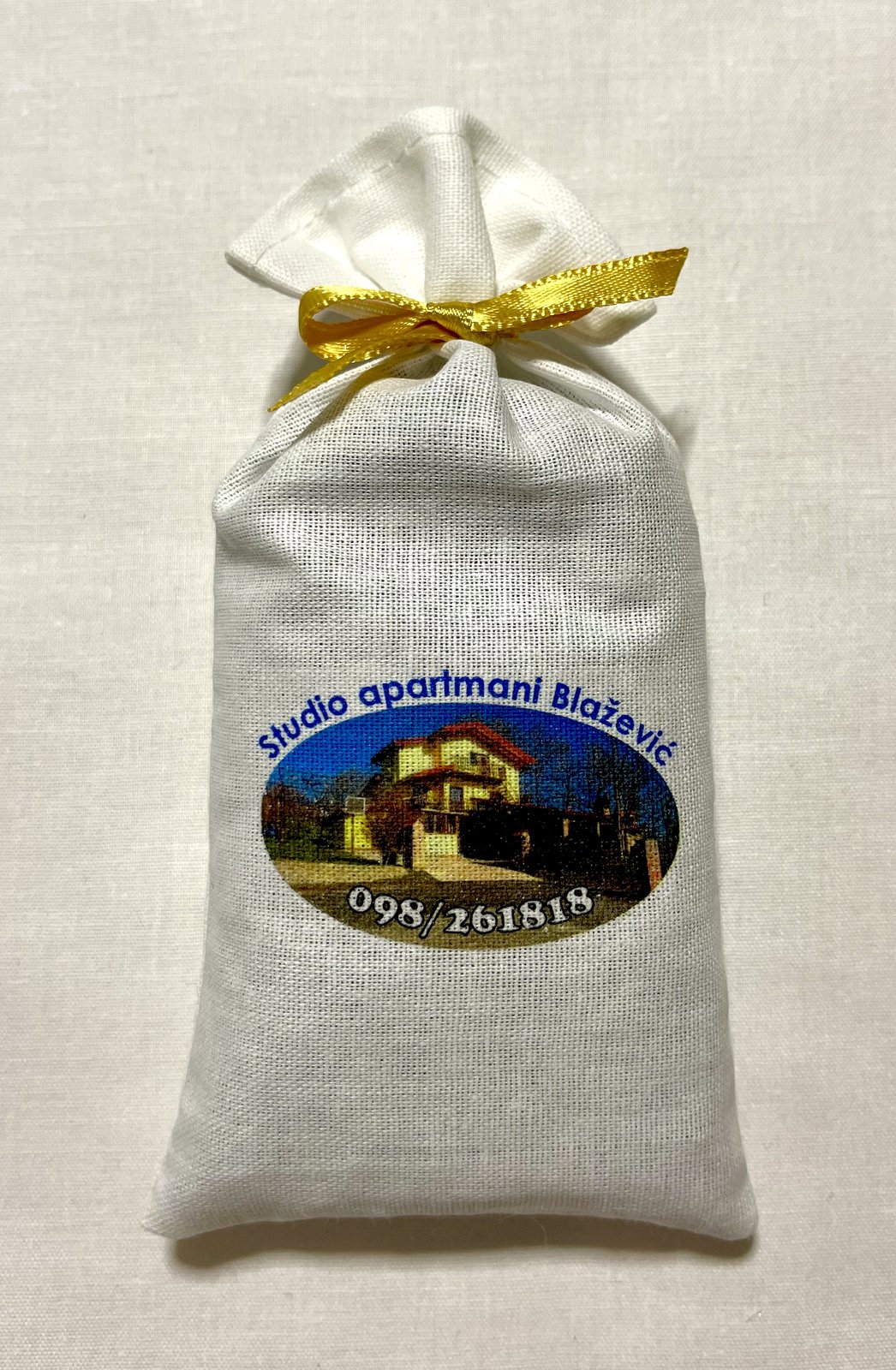 Pamučna vrećica dimenzije: 15cm X 8cm sa tiskom u boji i 20gr. cvijeta lavande vezana satenskom trakom 0.70€ (5,12kn).