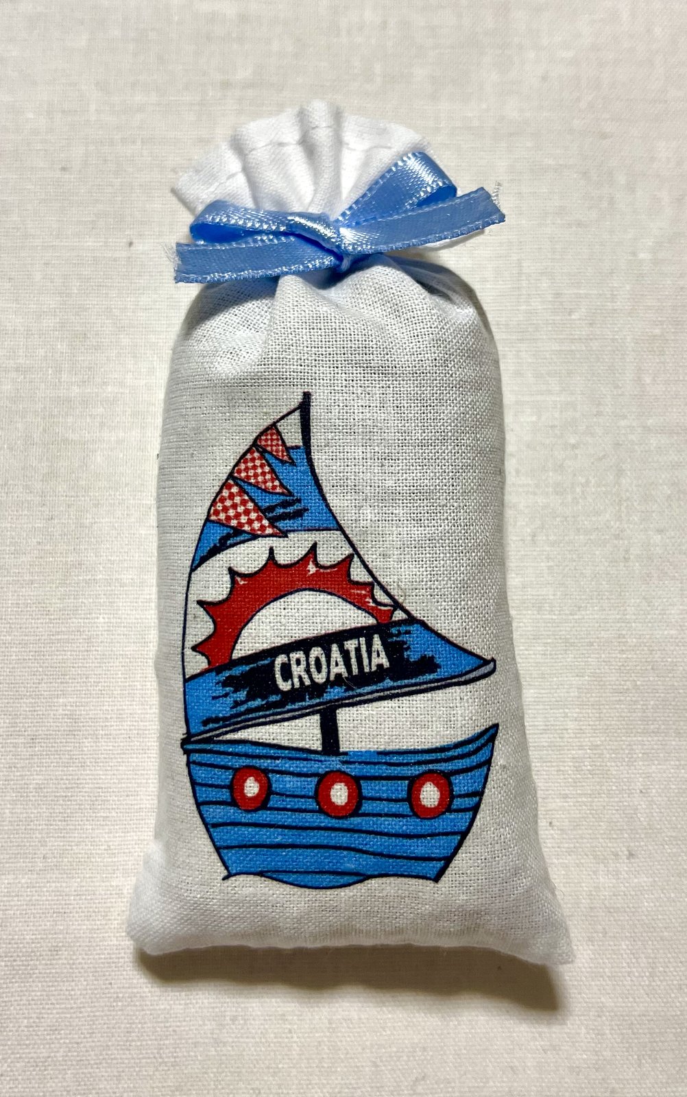 Pamučna vrećica dimenzije: 10cm X 5cm sa tiskom u boji i 6gr. cvijeta lavande vezana satenskom trakom 0.45€ (3,39kn).