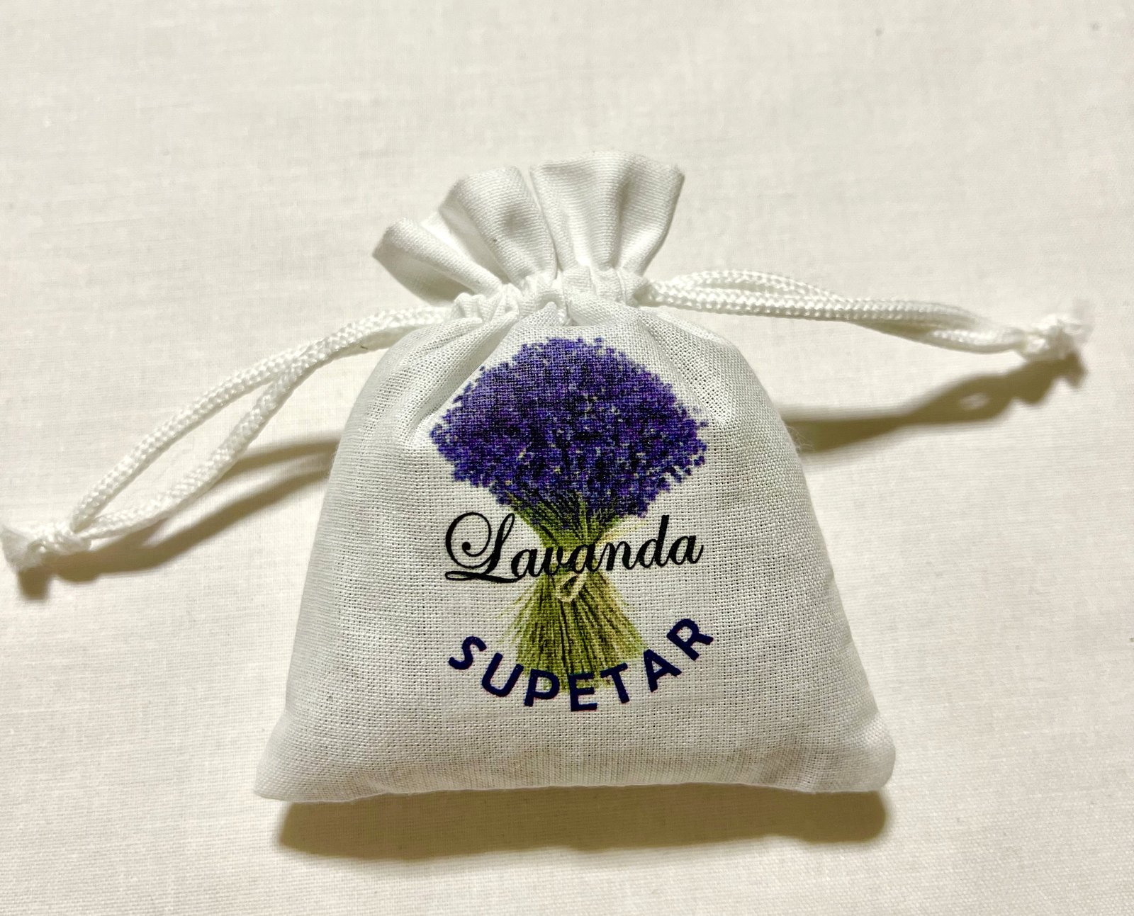 Samozatezajuća pamučna vrećica dimenzije: 10cm X 8cm sa tiskom u boji i 8gr. cvijeta lavande